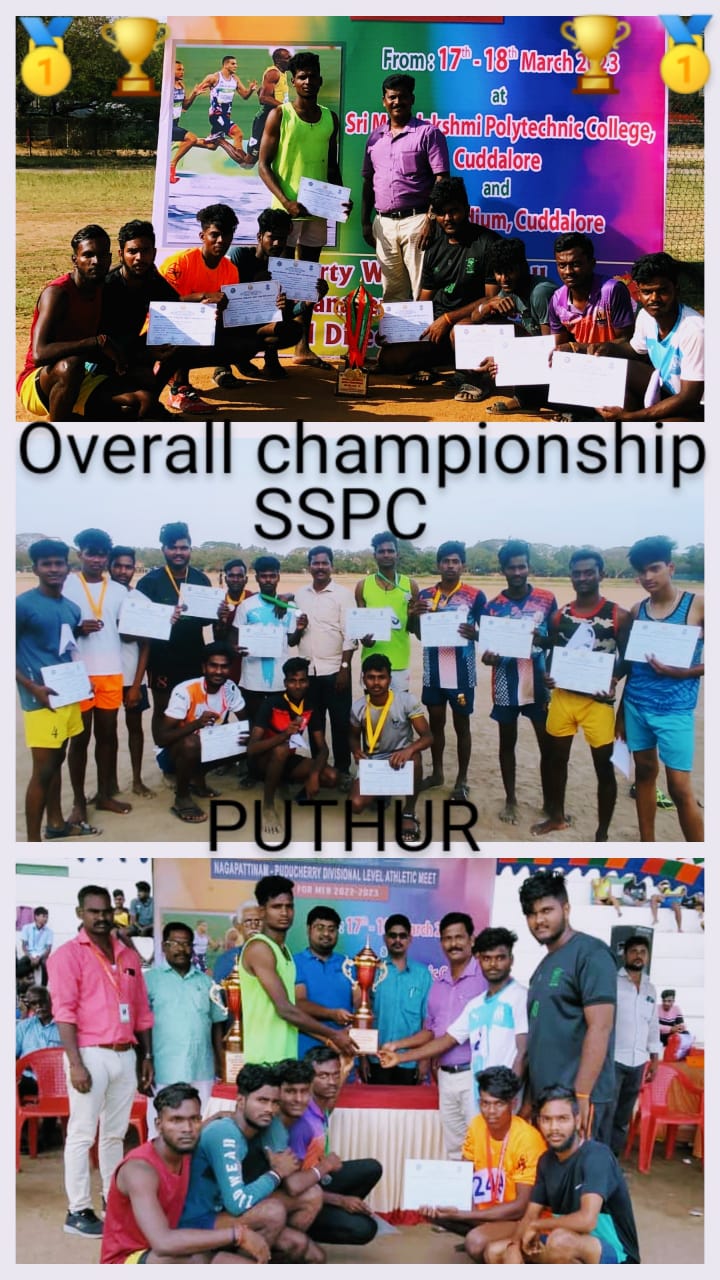 நாகை மற்றும் பாண்டிச்சேரி மண்டல பாலிடெக்னிக் அளவிலான தடகளப் போட்டியில் கலந்துக்கொண்ட அனைத்து போட்டிகளிலும் வெற்றி பெற்று 20 பதக்கத்தையும் மற்றும் overall championship யும் வென்றது SSPC புத்தூர்.